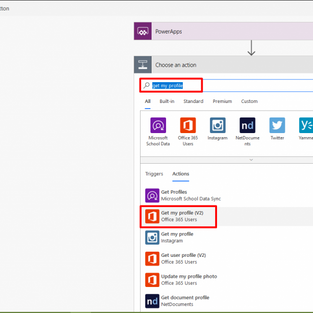 Under choose an action, type get my profile– Select Get my Profile(V2)